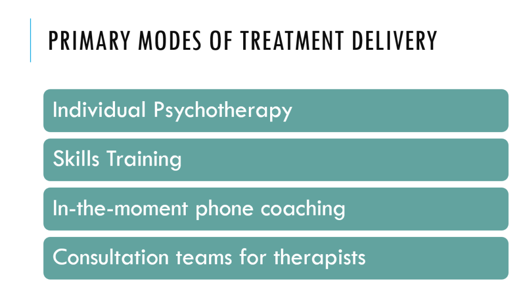 The goal of DBT is to help clients “build a life worth living” [M. Linehan] and help individuals to change patterns associated with life problems. There are 4 main modes of standard DBT treatment: