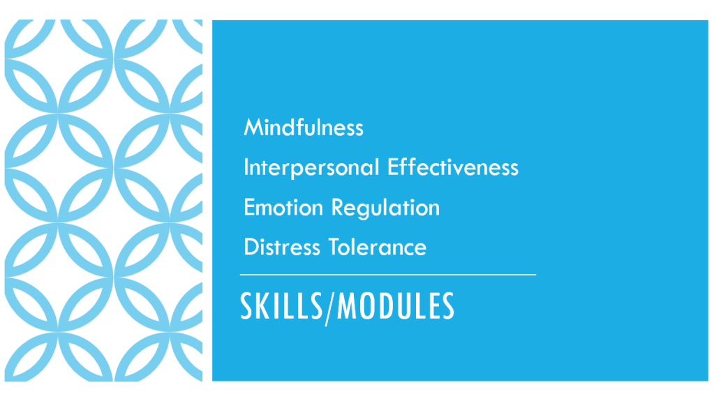 Here are the 4 main skills taught in DBT. These skills help clients learn how to enhance their lives and find other ways of coping with situations or problems: